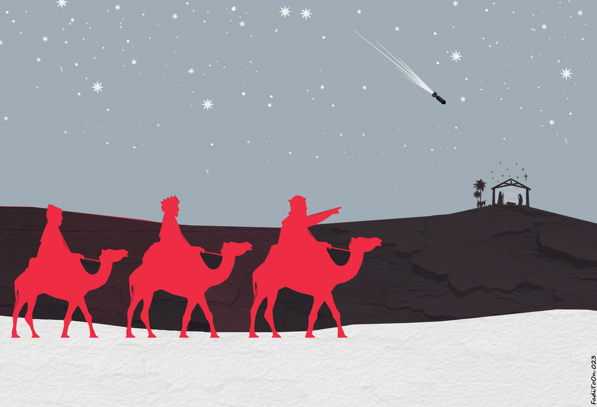 Fadi Abou Hassans bidrag til utstillingen Illustrerte julekort – Fribytegnernes jul på MiA Avistegnernes Hus 25.11 - 21.12 2023.